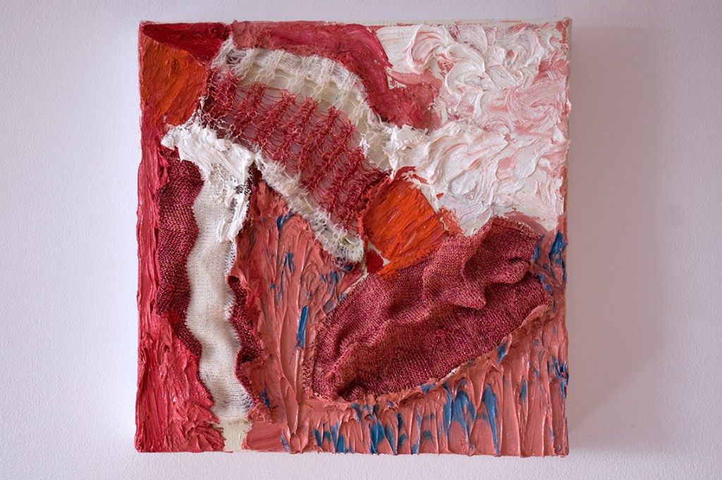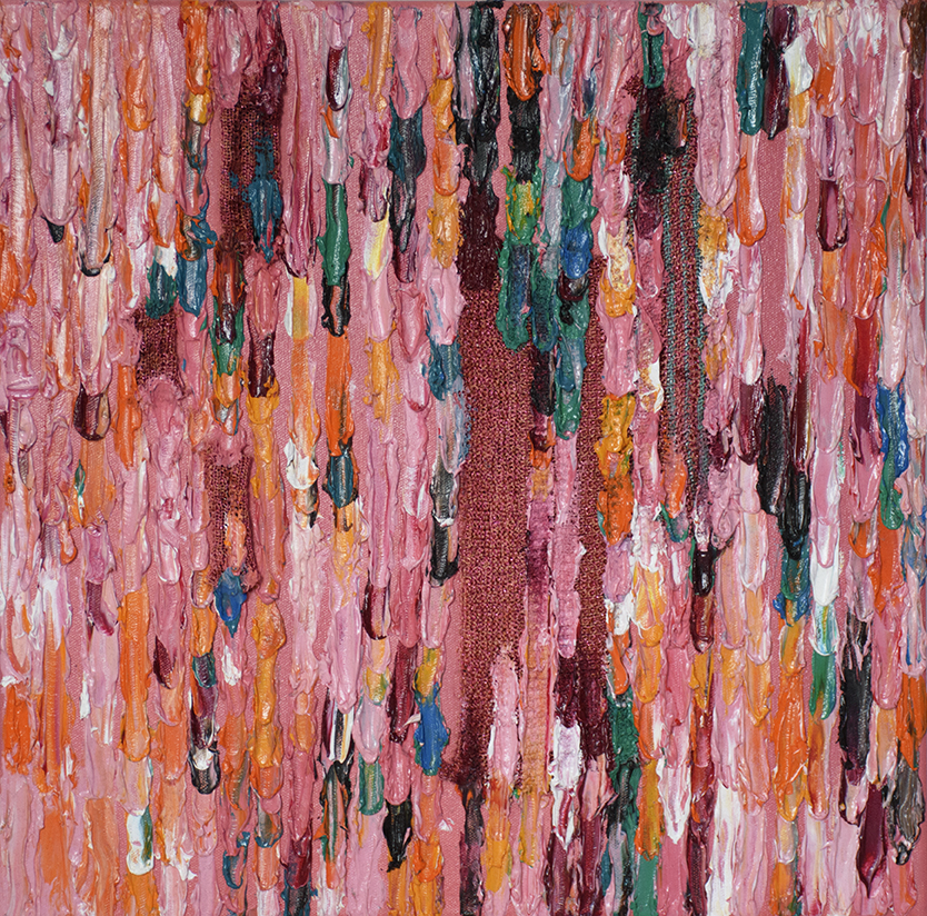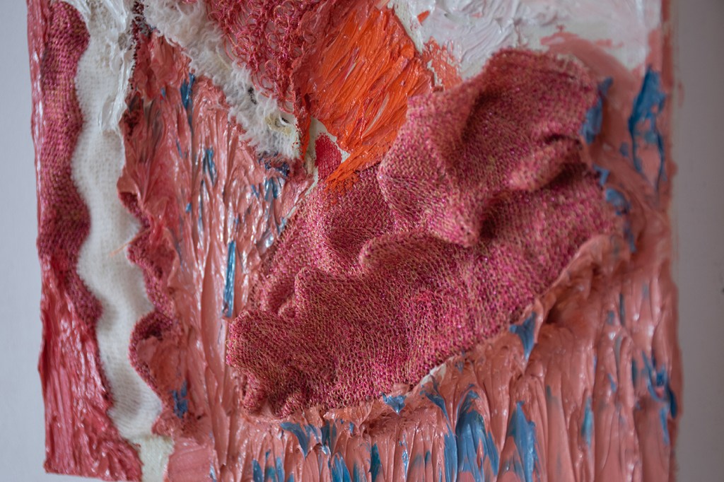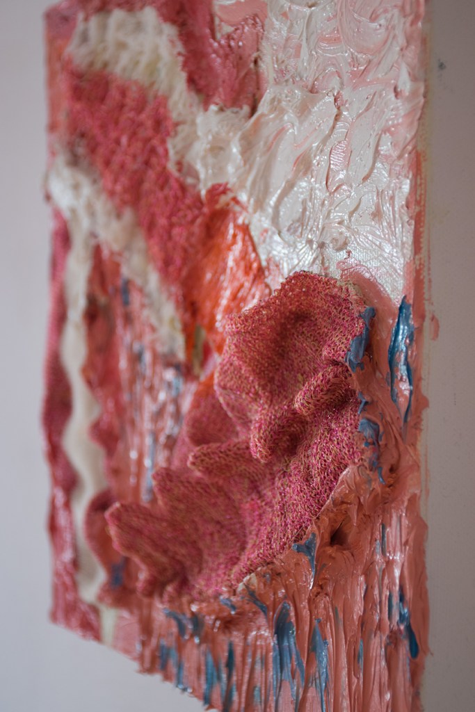 As with canvas, knitting techniques can vary depending on the thickness of the wool. You have to adopt a specific technique to suit each particular material. My painting ‘Knitting’ (as the title suggests) is based on knitting and, after studying Laura’s knitting samples, I found a way to represent it through paint – by employing fat layers of oil colours I was able to find a similar way to work. One colour connects to the adjoining second colour, and the whole structure builds slowly as with knitting.