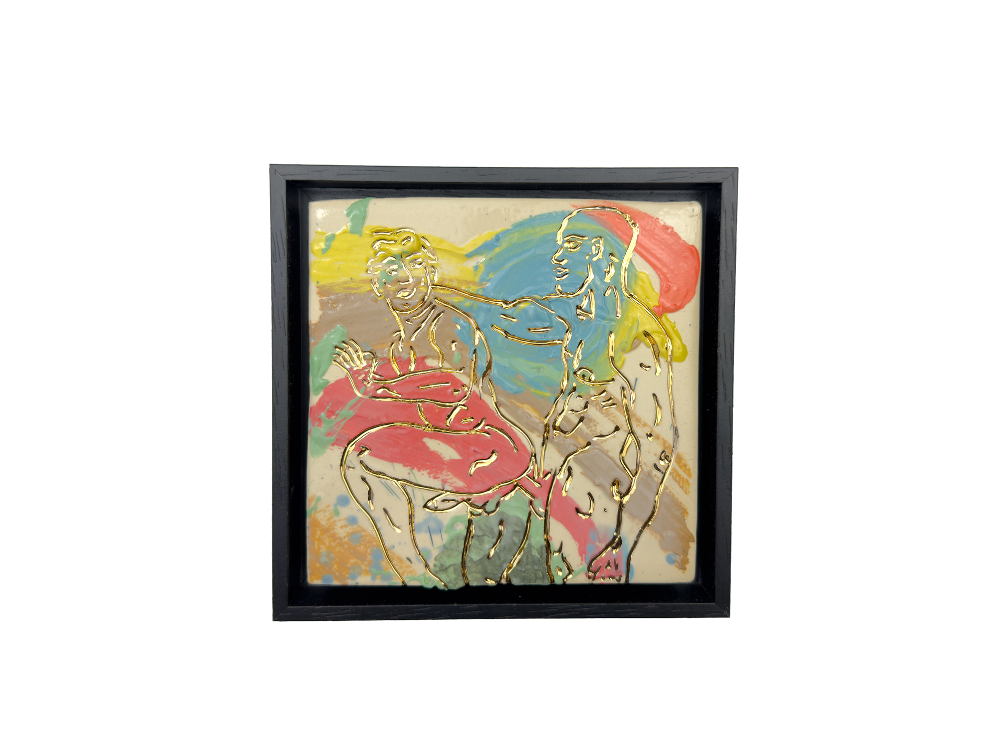 Glazed Ceramic Stoneware + Gold Luster + wooden frame  2024