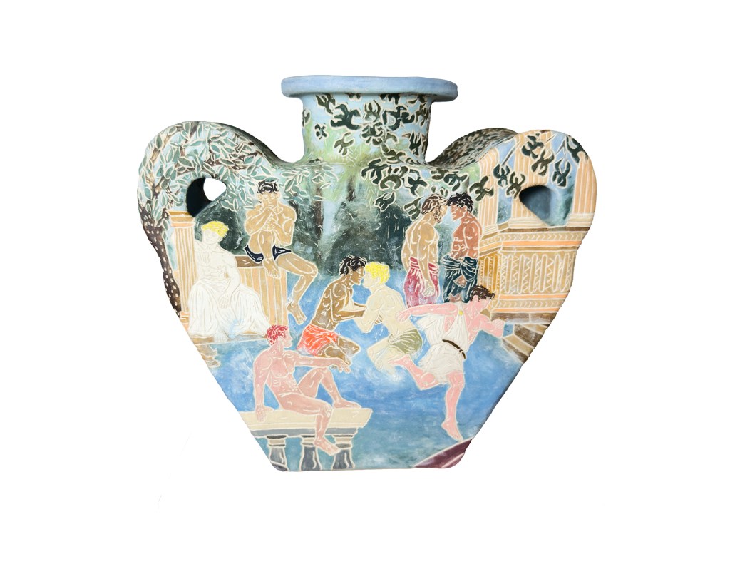 Around this mythological moment unfold scenes of encounter: bodies resting, watching, touching, and moving through spaces of leisure and athletic exchange. These environments collapse the distance between divine and human worlds, suggesting that the lives of gods, heroes, and mortals unfold within the same architectures of desire, competition, and intimacy.