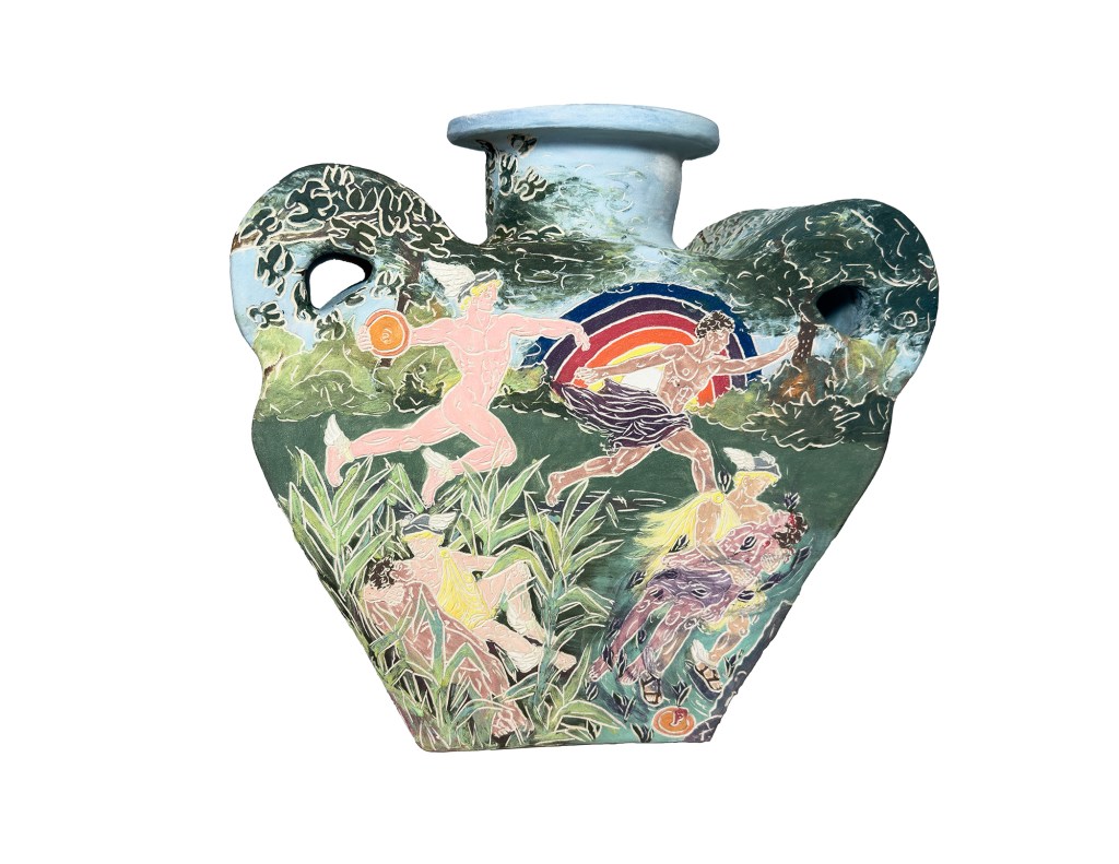 This vase forms part of a series drawing on the visual language of ancient Greek ceramics. The imagery references the myth of Hermes and Crocus, a beautiful youth accidentally killed when Hermesโ discus strikes him during an athletic game. From Crocusโ spilt blood the crocus flower emerges, transforming loss into a lasting image.