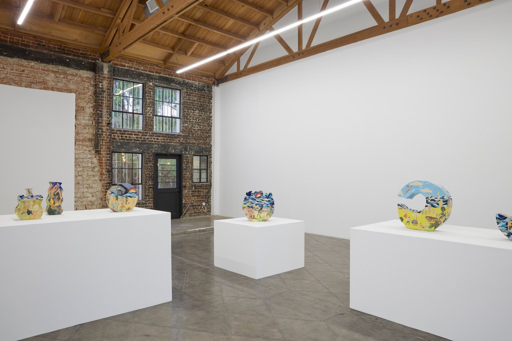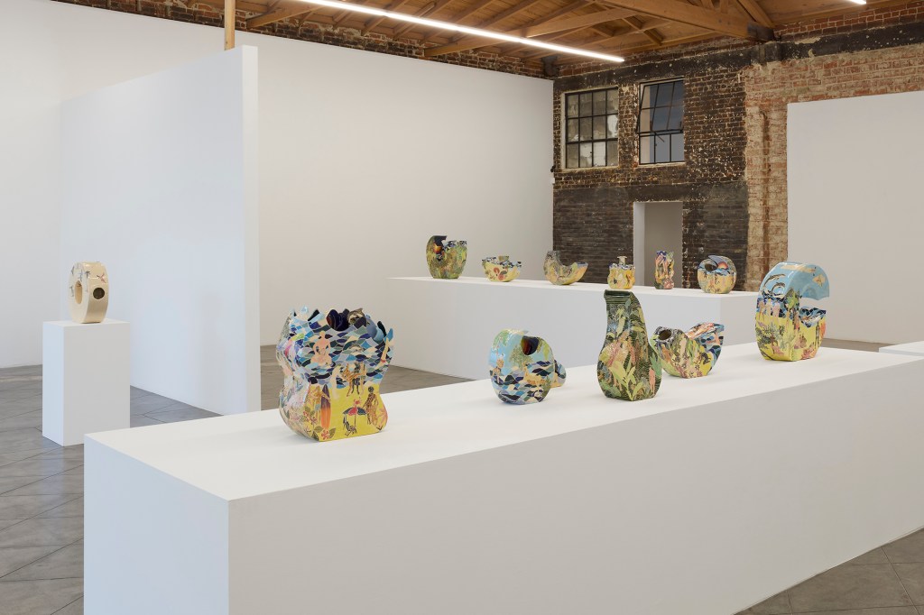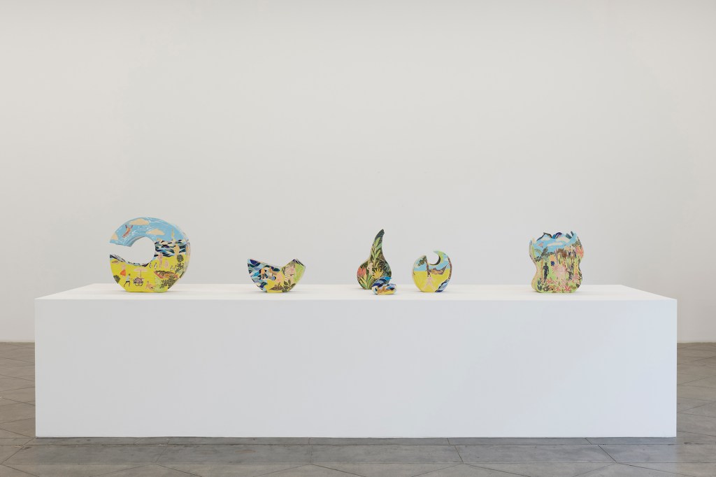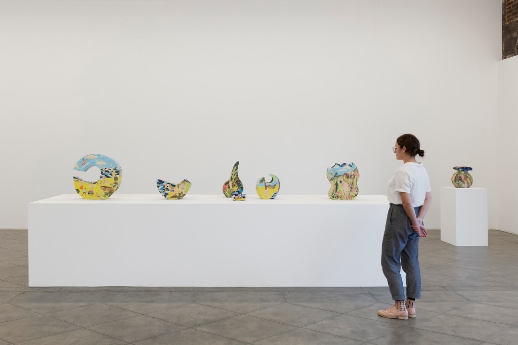 Strzelecki’s works encompass a range of influences. Looking to the canon of Western art, he draws upon fantasy of the exotic and projection seen in Rousseau’s wild landscapes and Hockney’s swimming pools. Christian iconography and ancient mythology also appear. Themes of creating and inhabiting his own world continue in the exhibition with a suite of works called ‘Origin of the World.’ These four ring-shaped nearly monochromatic vessels interpret the biblical depiction of the creation story—sea, sky, sand, and jungle—the foundation for his own ‘gay garden of paradise.’