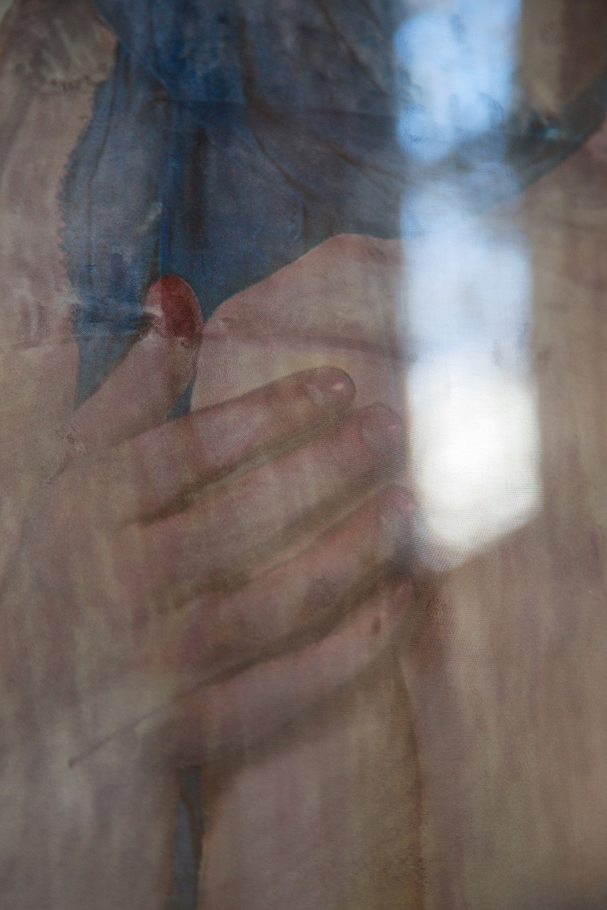 Transferring the life-size photograph on to this diaphanous fabric generates a ghostly, mysterious effect somewhat akin to the Turin Shroud. The picture becomes almost visible, but not sharp enough to see fine details. Shifting the picture to an 8m long veil allows a deeper connection with history from the Bible where Matthew writes: “And behold, the veil of the temple was torn in two from top to bottom; and the earth shook and the rocks were split.” I want to question the outmoded meaning of orthodox religion in the 21st century.