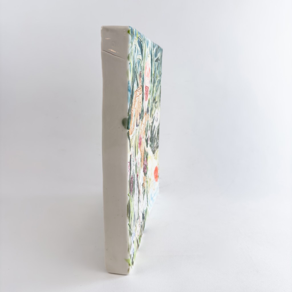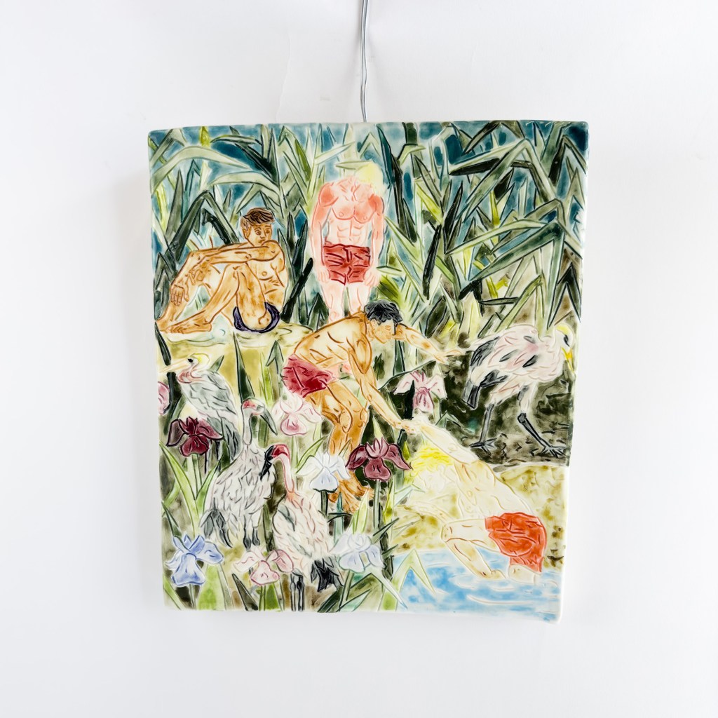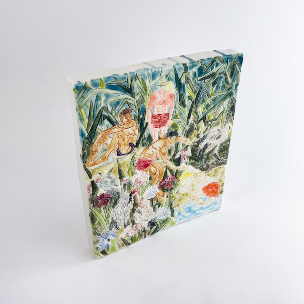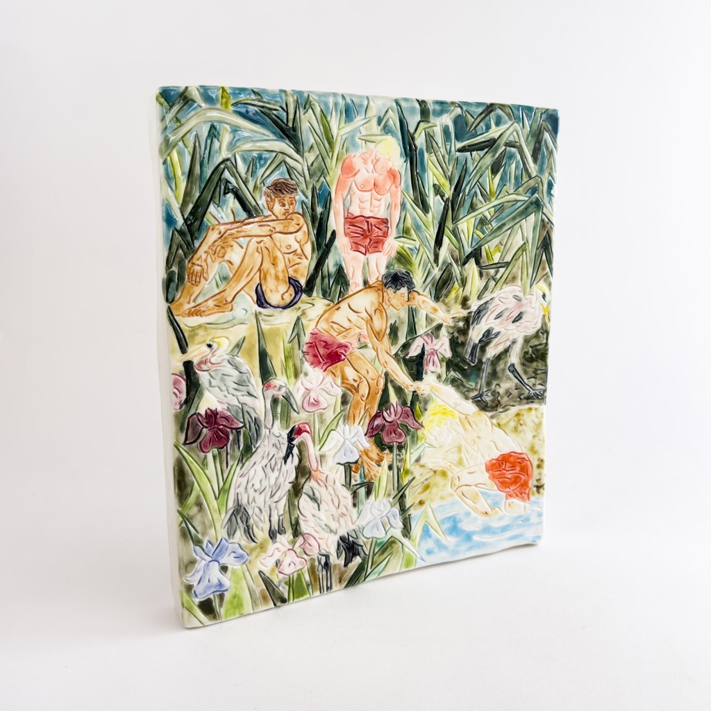 Pulling a boy from the pond 31x27x3.5cm 2.8 For availability and more information contact British Ceramic Biennial Back to ceramic canvas Glazed Porcelain 2023
