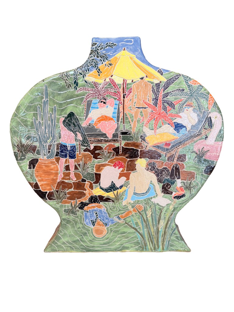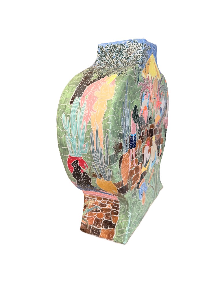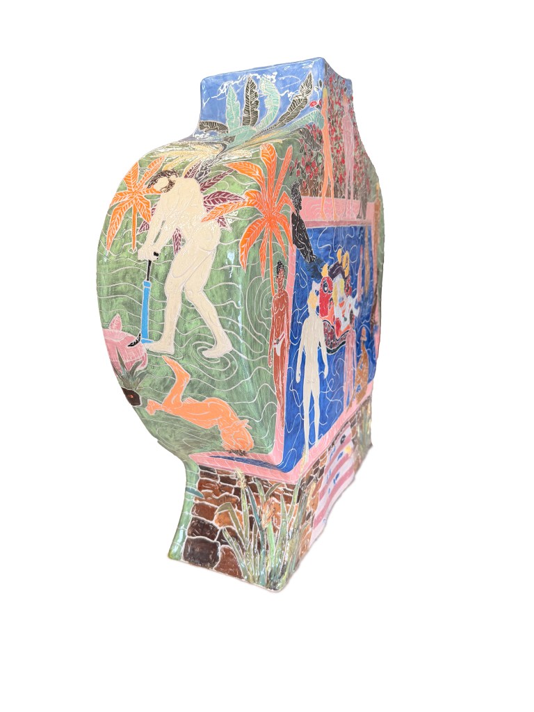 Sicilian Bathers is a unique ceramic vessel capturing the peaceful atmosphere of southern Sicily, in Noto, a luminous, rare place that invites return visits and quiet contemplation. The piece reflects the ancient beauty of the male form, observed in sun and rain, and was sketched over a week spent immersed in this landscape.